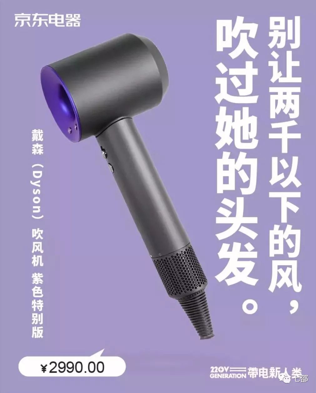 看看戴森电器是怎么卖的,“别让两千以下的风,吹过她的头发”,直接把苗头指向了目标客户的男朋友,虽然贵了一点,但是浪漫啊。
