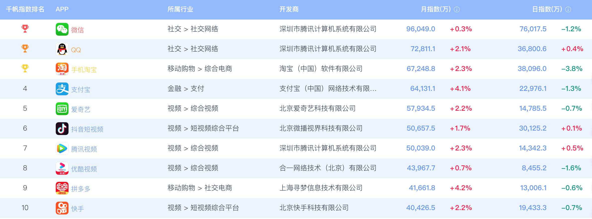 这不是最关键的,你再去对比抖音每个时期的日活和月活,你会发现每两个当月打开过抖音的人就有一个是天天看抖音的。你去翻看各大APP榜单上的日活和月活数据,只有微信、QQ和支付宝有这样的黏性,其他娱乐性APP的月活都是日活的4倍左右(也就是每四个当月打开过该APP的人只有一个每天打开一次)。