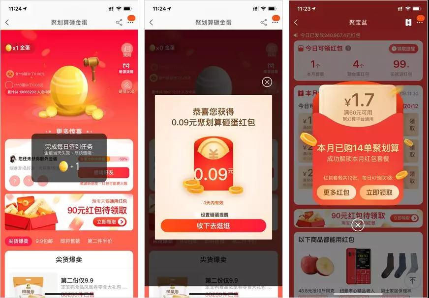 聚划算上还有很多针对下沉市场用户的运营玩法(拼多多既视感),比如签到领红包、砸金蛋领红包、下单返红包等操作。这类“红包套路”就是利用用户的“损失厌恶”心理,低成本转化用户。