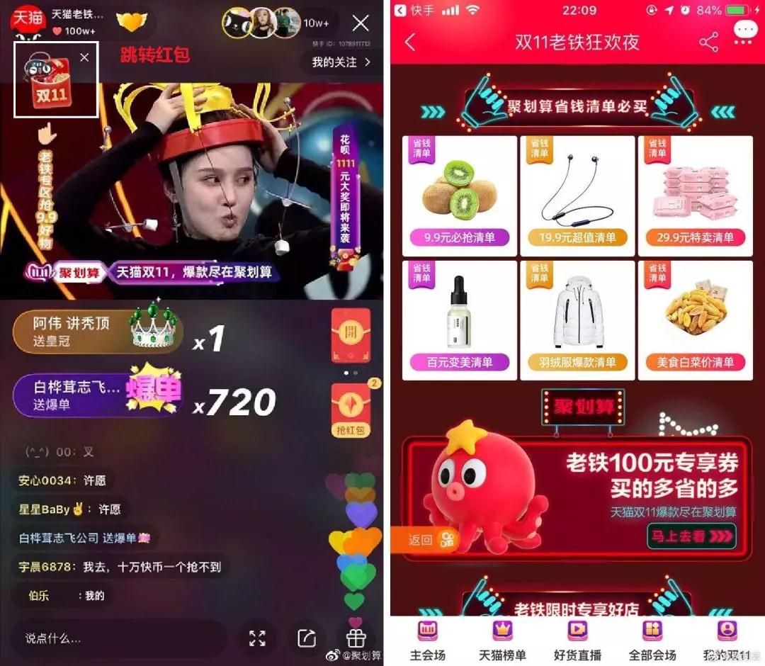 而且,天猫还联合快手举办了“双 11 老铁狂欢夜”,邀请 50 余位头部红人进行直播卖货,通过直播的形式引流到聚划算的双11 会场,深度触达“老铁”用户。