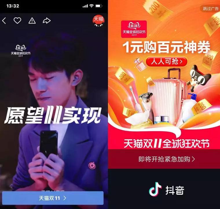 天猫与抖音的合作相对比较轻量级,主要是在抖音头部红人的视频植入了“红包道具”,通过达人的场景演绎,引导用户点击红包进入双11 会场。