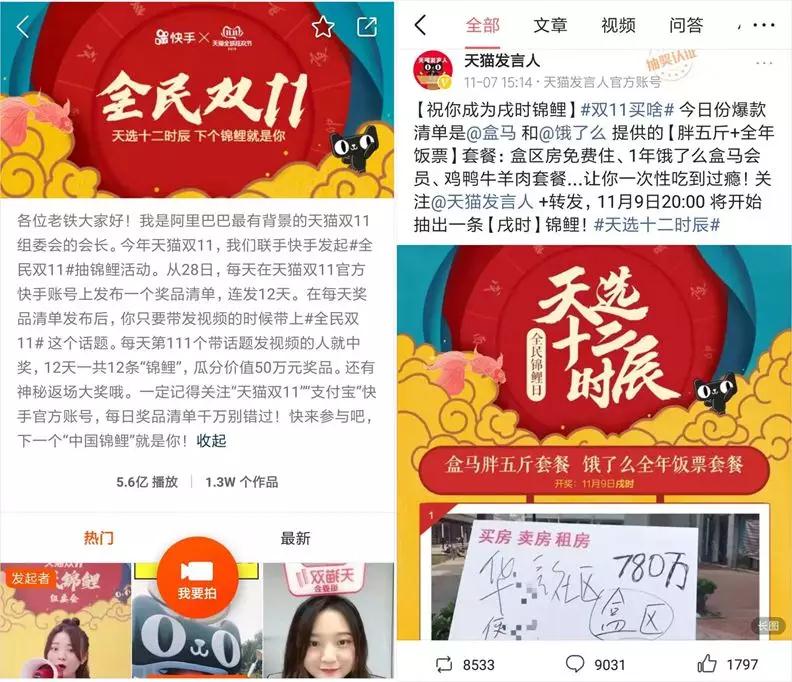 例如头条,每天的活动信息转发量都达近 1 万;而在快手上,“全民双11”这个话题的视频播放量也超过了 5 亿。