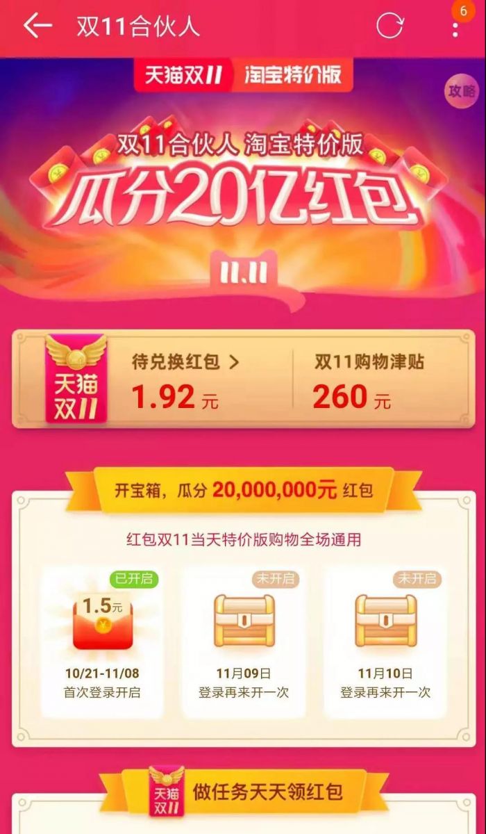 就拿双 11 合伙人的项目来说,同样是瓜分 20 亿红包,淘宝需要完成任务、升级喵铺才能瓜分红包,而淘宝特价版的用户只需要在规定的时间登入淘宝特价版“开宝箱”,即可获得红包。