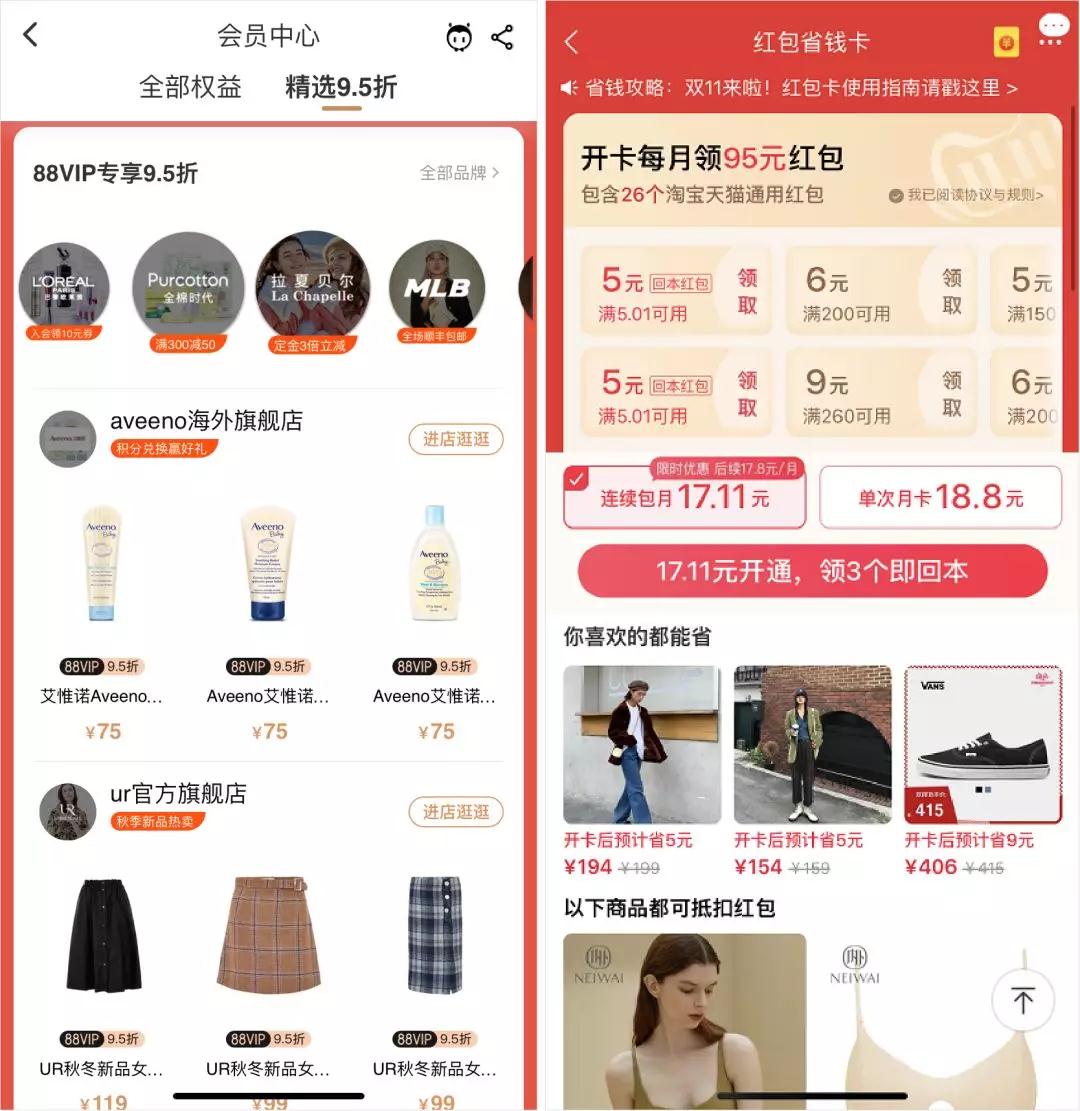 左:88VIP;右:红包省钱卡