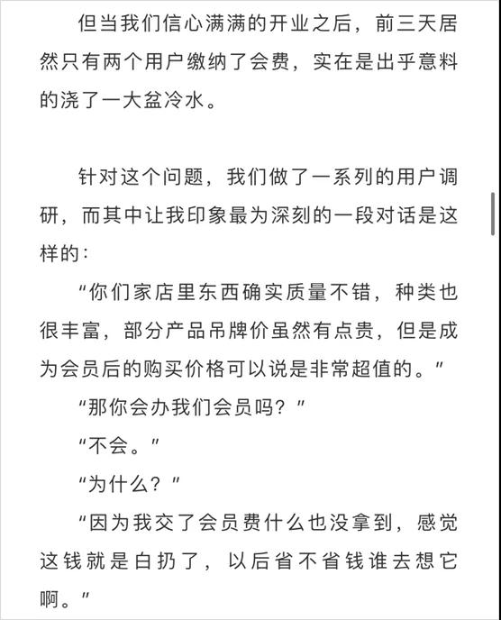 当我在思考这个问题的时候,今年 6 月刷屏的《我在下沉市场生活的一个月》一文中,有一段对话给了我启发。这段对话显示,下沉用户认为交了会员费等于什么也没拿到,感觉自己的钱就像白扔了。