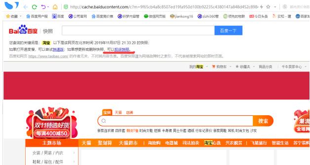 第三步:比如你搜索淘宝或者你们公司主关键词首页被挂码 你点击百度快照。