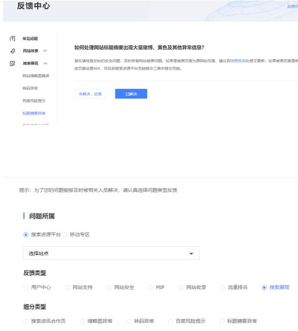 找到百度搜索资源中心, 首页点击,反馈中心—- 搜索展现—-标题摘要异常。