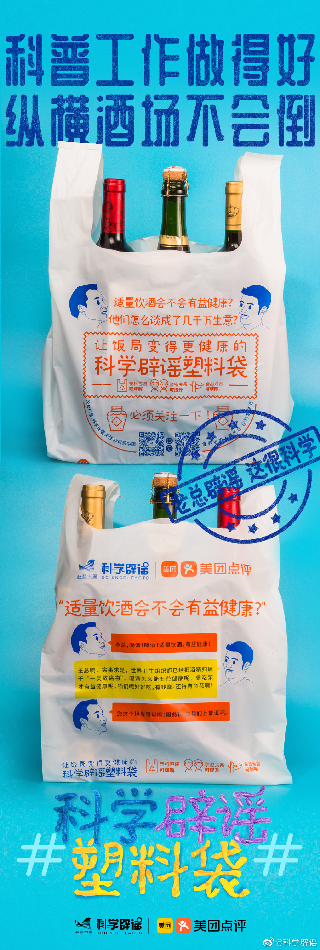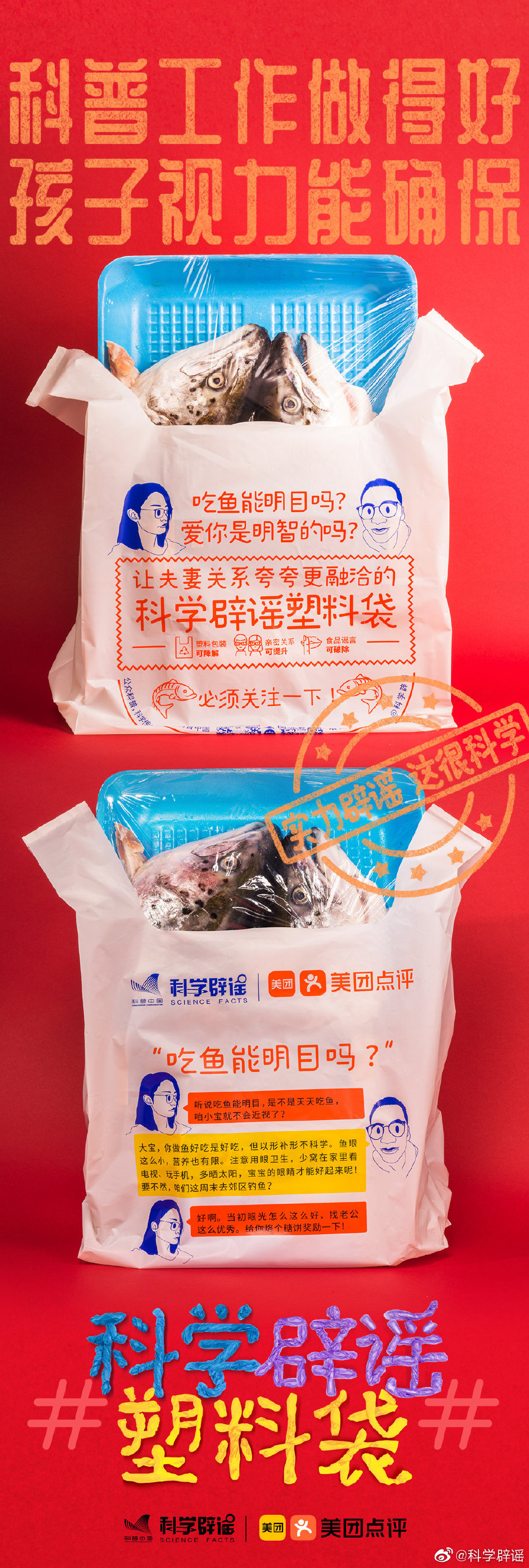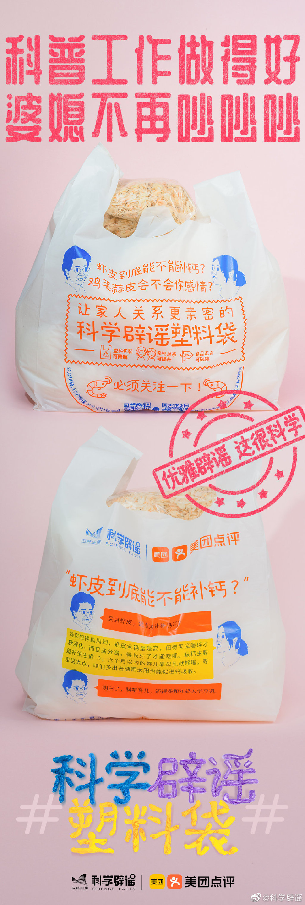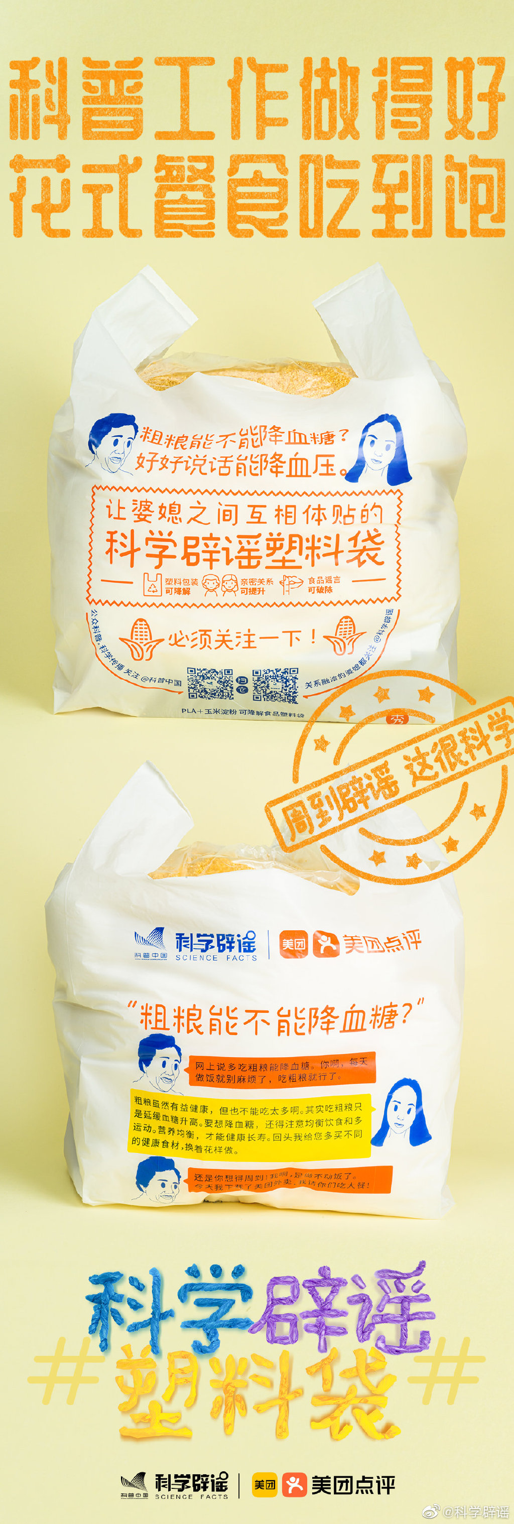 近日,美团外卖联手科学辟谣平台推出了可降解的 #科学辟谣塑料袋# ,遇到食品谣言怎么办?就让真相拭目以“袋”!