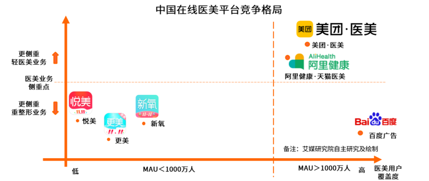 艾媒咨询《2019年中国轻医美消费趋势研究报告》中,以医美用户覆盖度(平台月活流量MAU)和轻医美重整形的侧重点为维度,分析了中国在线医美平台的竞争格局。“后来者”美团医美强势领跑轻医美赛道。