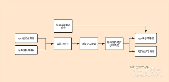通过网页端 / app端报名课程 —> 短信通知报名成功 —> 点击短信保存二维码 —> 关注公众号 —> 引导加老师微信 —> 个人号发送课程安排通知 —> 进群学习