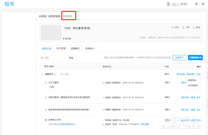 训练营是今年新兴的套路,市面上支持的SaaS平台也不少了,下面的截图来自短书。做一个训练营,你需要配置这些基础: