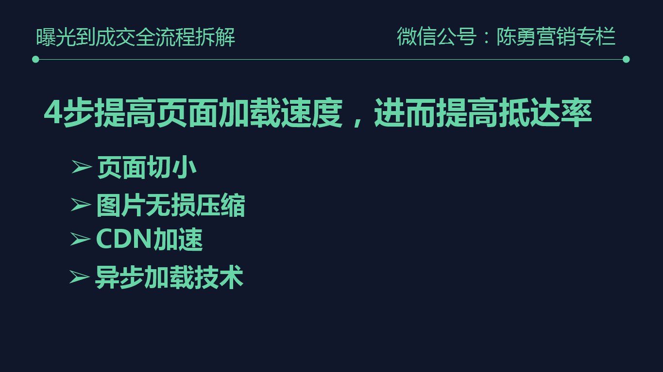 但是如果用超级转化率,就会统计抵达率、表单填写率、表单填写成功率三层的转化率,如果抵达率低于90%就应该提高页面加载速度和增加用户耐心,其中提高页面加载速度可以通过以下四个方法来实现: