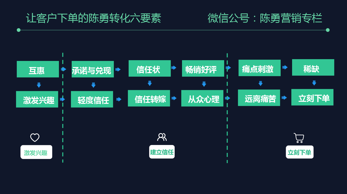 这些因素合并同类项之后就有了「陈勇转化六要素」:互惠、承诺与兑现、信任状、畅销好评、痛点刺激、稀缺,而这六个要素的作用如下: