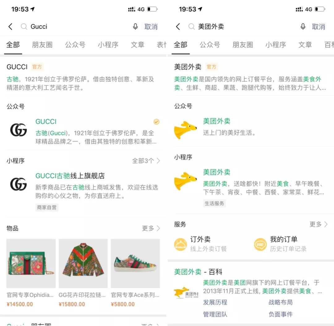B级官方区可配置3个置顶搜索词,并囊括基本展示样式,包括小程序、公众号、服务以及商品,用户搜一搜即可触达全面的品牌服务。