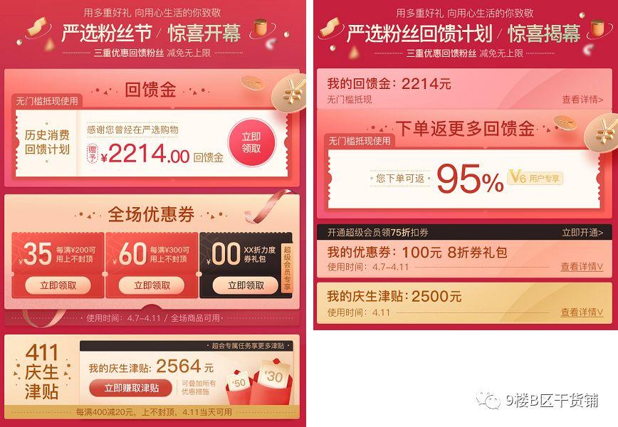 与平台型电商不同,严选作为一个品牌,需要在一场大促活动中整合出一套通用的核心利益点。让用户在促销期间对严选的玩法有感知。例如:“全场8折券”,“下单返回馈金”。