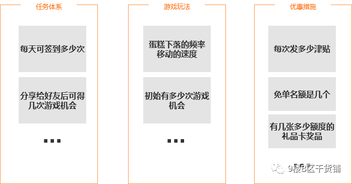 - 优惠措施:根据成交的业务目的和刺激用户持续参与的目的,设计不同的奖品,普发的奖品用来刺激用户下单,高价值的奖品刺激用户持续参与。