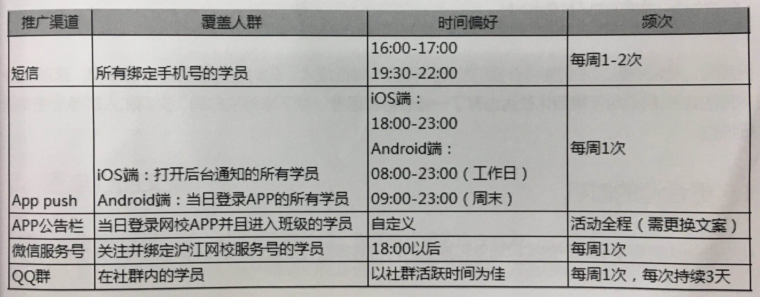 触达渠道分为主动触达渠道和被动触达渠道,即推送渠道和推广位。我们目前已有的渠道有很多,其中最常使用的是短信、微信服务号、APP push、QQ群和班级公告栏。