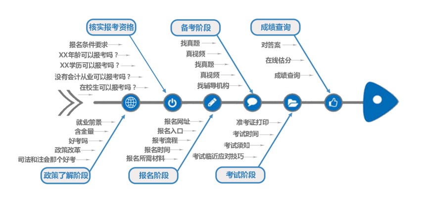 以在线教育举例,这是CPA项目的一个项目考试周期历程和人群需求分布: