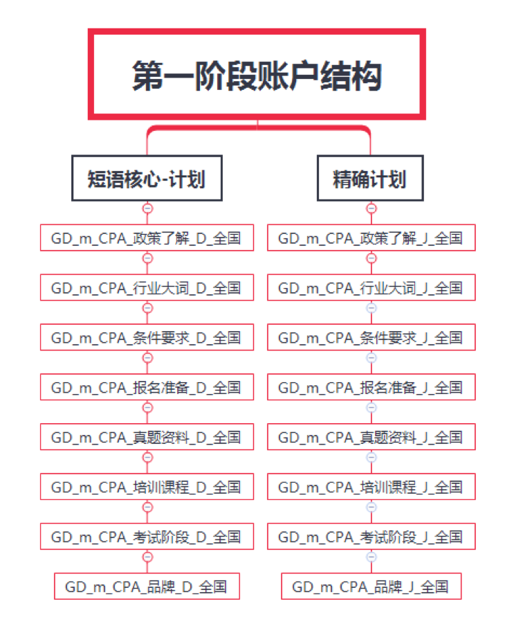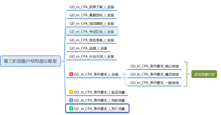 还是以在线教育CPA项目为例,附上第三阶段规模化放量的账户结构: