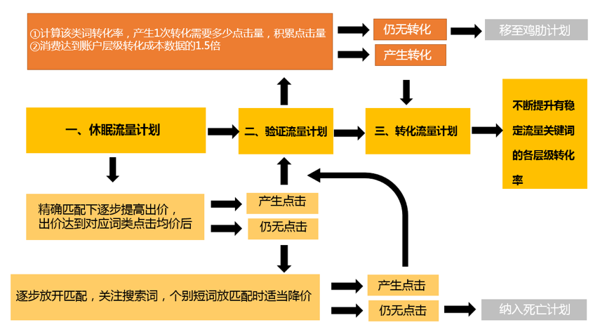如果休眠流量经过优化后产生了有效点击量移至验证流量计划,仍然无展现或者展现虚高无实际点击的纳入死亡流量计划,如果验证流量经过优化后产生了线索转化移至转化计划, 消费达到现有可接受转化成本的1.5倍仍然没有转化也可即可纳入鸡肋流量计划,最终我们通过一系列的优化和筛选出的死亡流量和鸡肋流量的关键词是需要摘出来单独建立计划暂停的,推广账户是动态流转的,今年这个优化师操作,明年可能因为人员离职或项目调配变成另一个优化师操作,因此切忌删除账户里的关键词,暂停即可;直接删除关键词下一个优化师接到账户又可能会将之前删除的词加入账户再测试一遍,这种重复性的测试成本是非常巨大的,毕竟当初能加入账户,说明这些词本身它是有一定相关性和意向的,只是后来我们通过数据验证它本身性价比过低或无法转化而已。