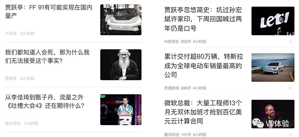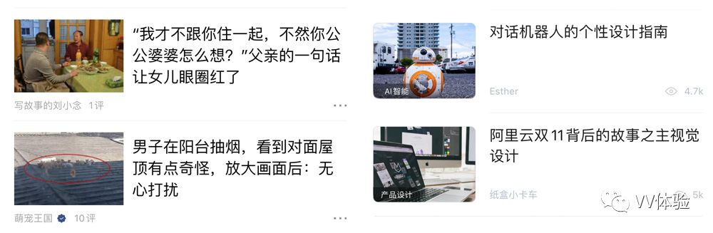 视觉重心仍然是图片,但用户的阅读顺序是从左往右,先看标题文字,标题如果不吸引人,用户看到图片吸引人,还会产生二次转化,真正能产生转化的前提还得用户感兴趣才行。所以说这种设计方式特别适合资讯推荐流,只是特别适合,不是说资讯产品就不能采用其它方式。其实具体还是通过设计细节来权衡,下文会总结出设计细节模块再做详细的讲述。
