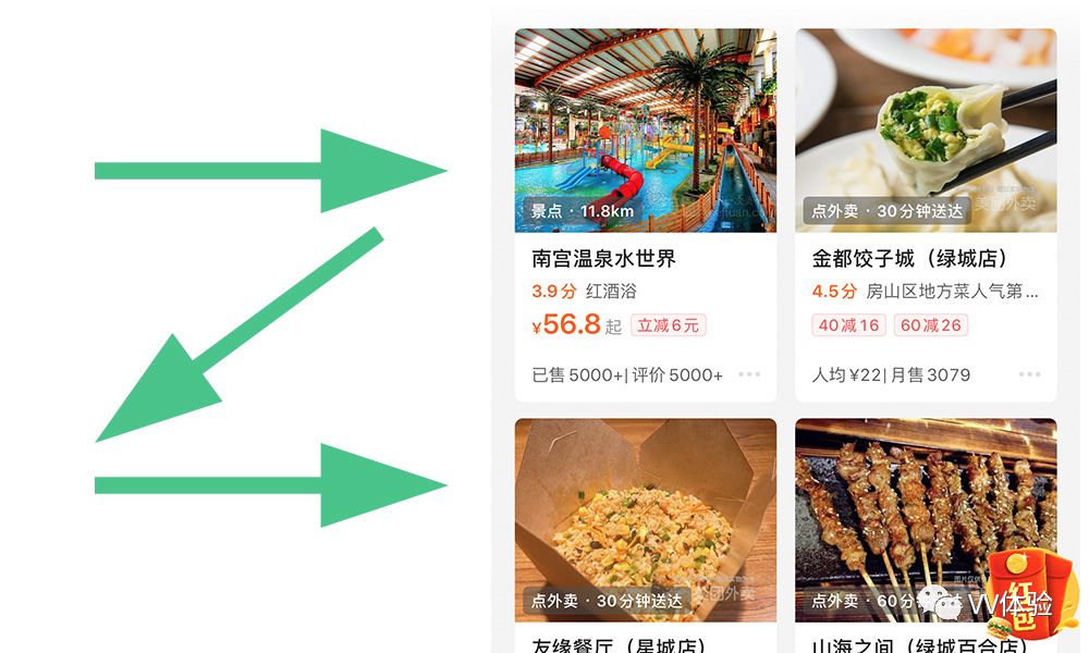 移动端经常会遇到双列的信息流设计,眼睛从左向右移动,在视线移到右上角后沿着斜对角向下方走,然后视觉再次向右移动,视觉移动的轨迹就像字母Z形状。Z字形趋向于在移动端,双列图文组合的设计类型,用户的视线来回切换,对沉浸式体验会产生一定的影响。