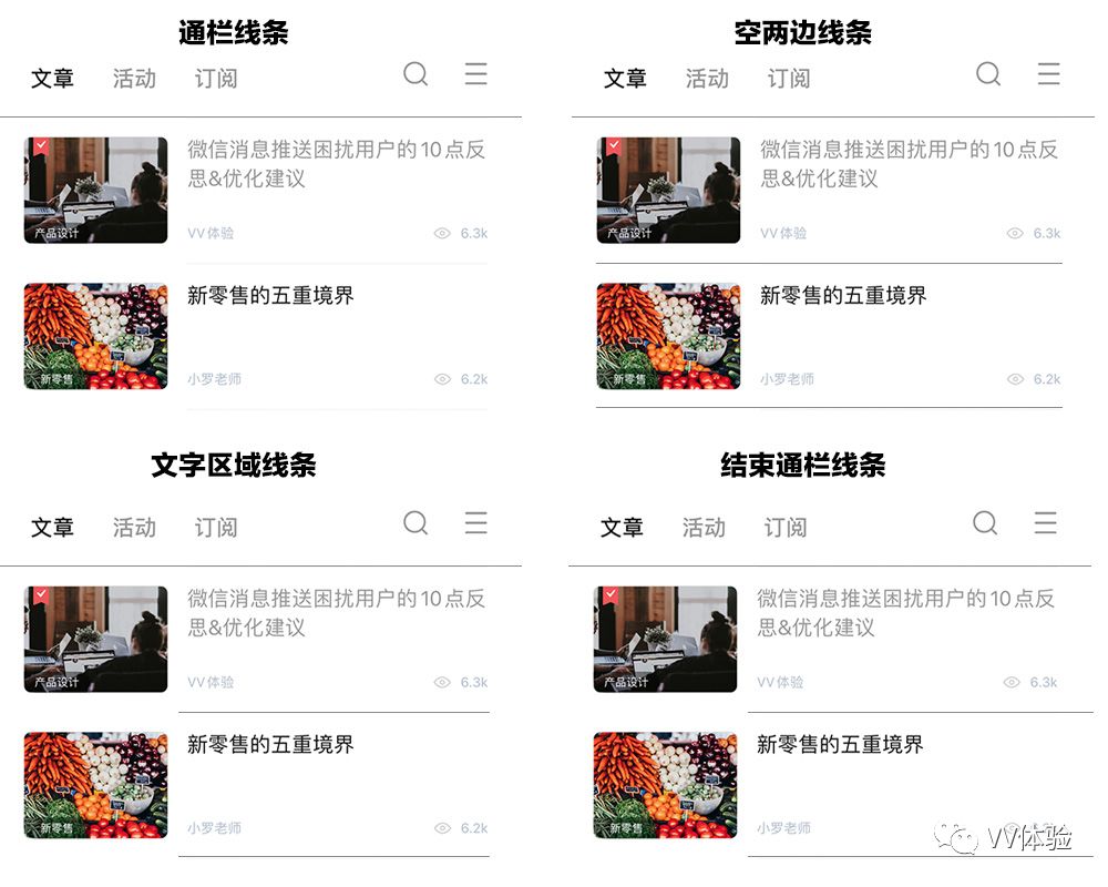 线条作为使用最多的区隔上下文的分界线。用的少了,整个界面会显得傻傻分不清。用的多了,又会显得出手过重,不够简洁。所以线条一直都是最考验设计的元素之一。通栏线条分割线阻断性比较强,栏目标题的意味比较强;两边留出空隙的分割线加强了并列的延续性;留出图片只分割文字区域提升了用户的引导属性;线的开端处留出空隙通栏结尾,这样的线条加强引导用户操作进入详情。