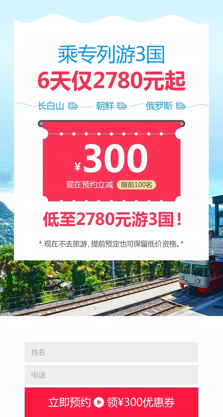 超性价比的旅游费用加上限量套路,有效激发用户求利心理,在表单按钮处加入“预约领券”等字眼加深引导,进一步刺激转化。