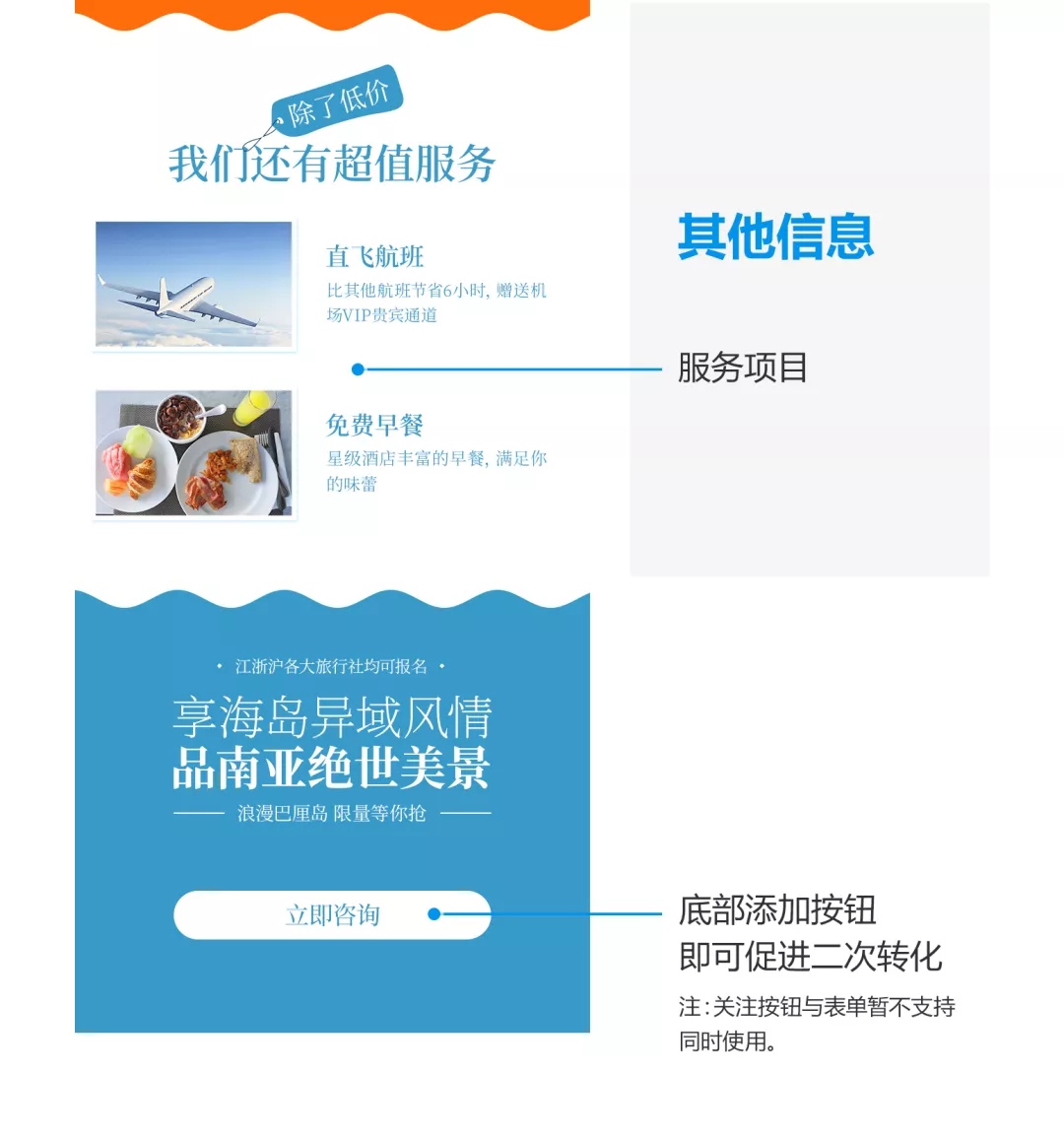按钮前面展示景点亮点吸引用户,添加关注按钮跳转公众号。备注:在旅游行业三种获客方式中,按转化效果排序分别为公众号关注>在线订购>表单。