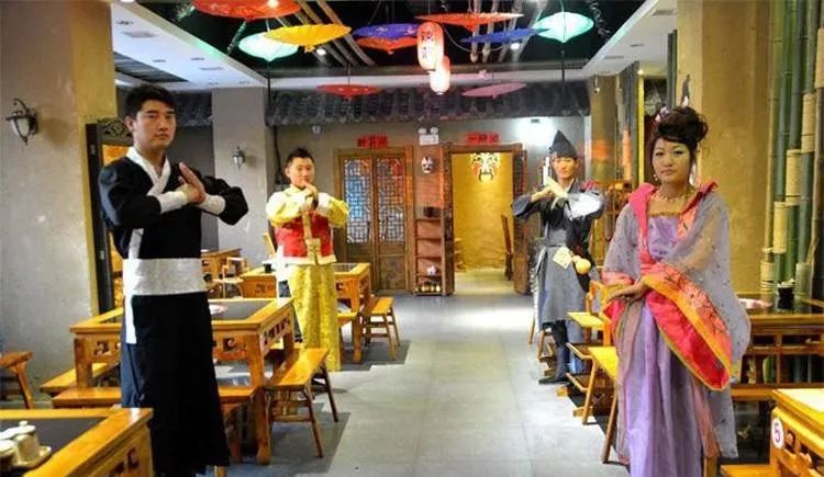 有些网红店在上菜时会敲锣打鼓,身穿汉服,面带纱布等形象打扮。比如明星包贝尔的辣庄火锅的服务员就是有种穿越的感觉。