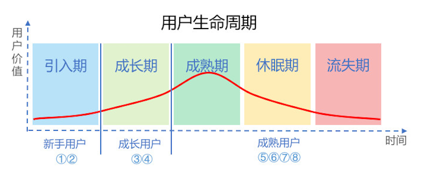 我们知道随着互联网用户需求的变化及社会生产力的提升,一个产品会呈现出“启动-拉新-促活-增值/营收-留存-流失”六大生命周期。而面对产品本身而言,用户也有自身的生命周期——新手期-成长期-成熟期-休眠期-流失期,五大用户生命周期。