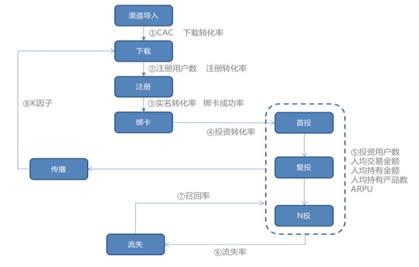或许有部分读者对上面的转化节点与关键指标的图表还不是很明白,下面笔者尝试用流程图的方式给大家聊聊。