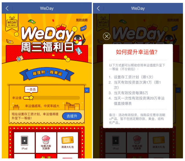 还有微X银行的“周三福利日”,为了引导用户提升幸运值(幸运值越高,中奖率越高),设置了通过存工资、首次投资、当日投资获取幸运值的规则。