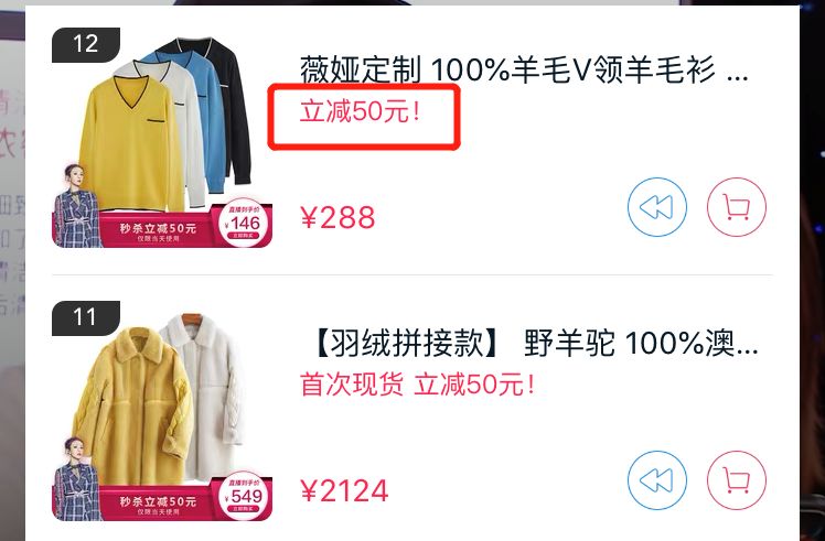 所以,大部分直播产品单价普遍比市场价要低。有的立减 50 元,有的立减 100 元,有的还低到了 5 折。