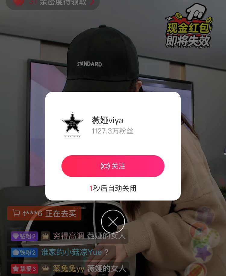 例如,多重关注提醒。在薇娅的淘宝直播间,我看了 5 分钟的直播,就弹出了近 6 次“关注直播”的提醒窗口。另外,抽奖的时候反复提醒粉丝:“如果没有关注主播,抽到奖是会被取消的哦。”