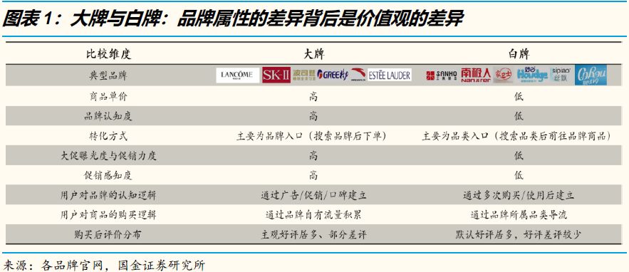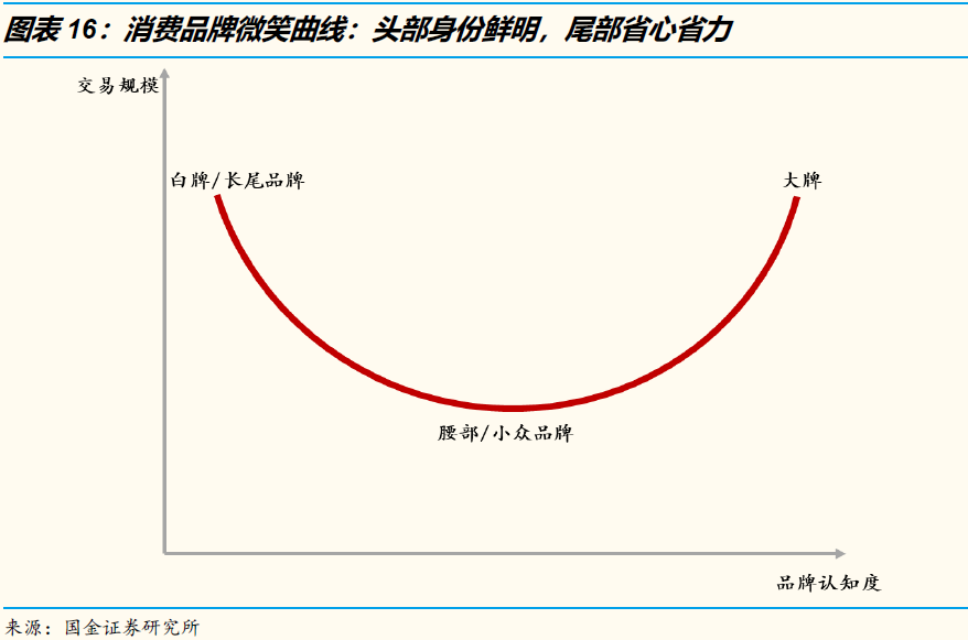 本篇报告我们参考微笑曲线形式,将品牌知名度高、公众广泛知晓、主要通过品牌自身影响力形成购买转化的商品品牌(线上购物时直接通过搜索品牌进入商品列表并最终形成交易转化)定义为“大牌”(头部品牌,微笑曲线右侧),如格力、美的、奥克斯、雅诗兰黛、欧莱雅、波司登、李宁、安踏、中顺洁柔等;将用户通过电商搜索所需品类进入商品列表,最后形成交易转化的商品品牌称为“白牌”(微笑曲线左侧),如南极人、北极绒、丝飘等;其余为腰部品牌,交易转化形式包括不限于线上的品牌与品类搜索等。