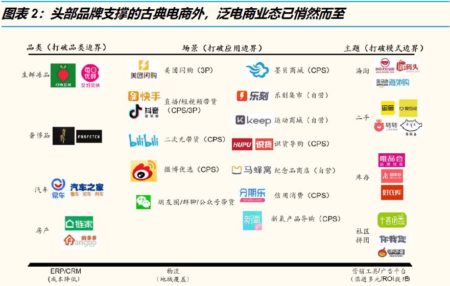 古典电商成为大牌商品和头部网红带货的重要阵地,泛电商生态将成为中小/腰部/长尾品牌的主战场以及流量溢出后所流向的核心地带:商业领域众多场景都在引入或借鉴电商模式,电商基础设施的不断成熟也为这些场景实现电商化带来了良好的条件。