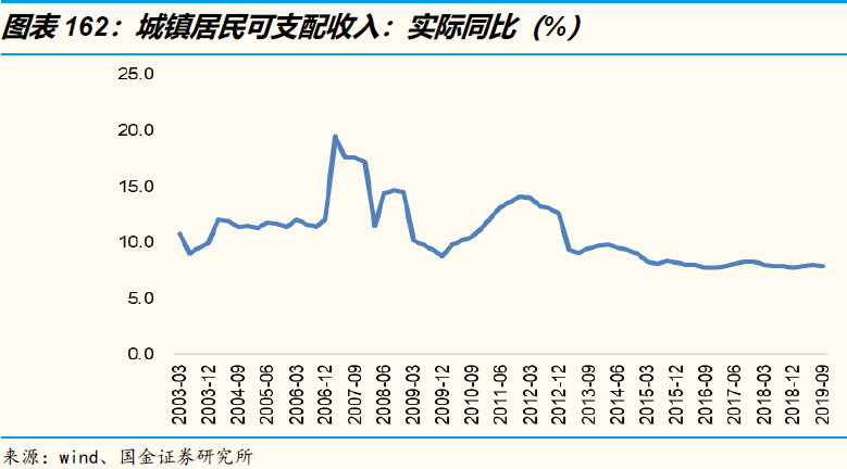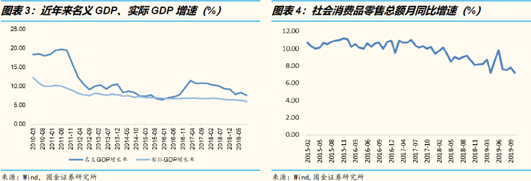 不过,往后看特别是2020年后 CPI 将维持高位,商品价格上升,名义消费支出被动上行。此外,减税降费对于消费也具有一定提振(据国金测算,增值税减税带来6500亿减税规模将能够被企业和消费者分享,而个人所得税调整以及专项抵扣也将带来4200亿的个税减免)。汽车消费方面,库存和销售同比数据均处于历史低位,未来看更差的可能性较低,因此,四季度名义社会消费品零售总额同比将会有所上升。展望2020年,消费在减税效应以及名义GDP带动下仍将有所增长。