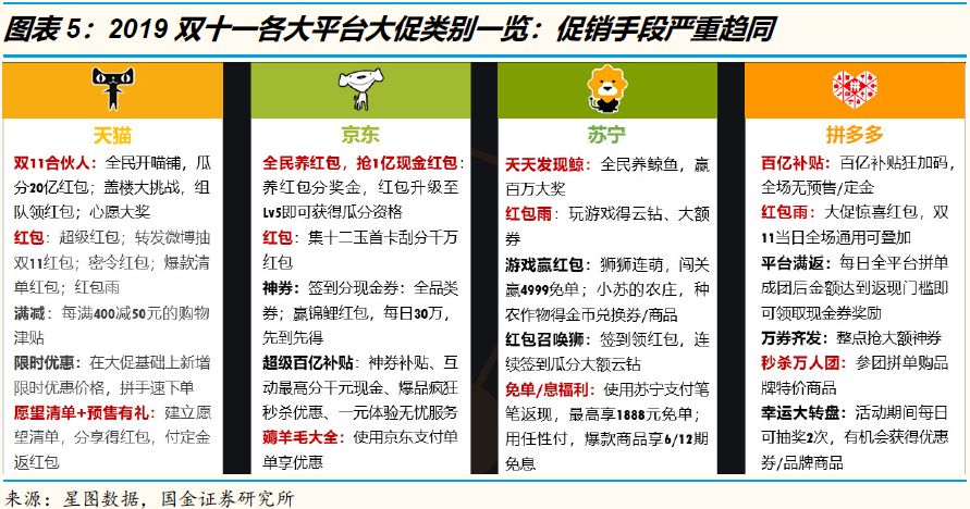 我们认为拼多多上的产品销售逻辑更容易催生爆款单品,因此在品牌调性正在爬坡的基础上,单品逻辑是冲量的重要武器:爆款销量的转化更多需要用户“放下戒备”打开钱包;因此2019年双十一“百亿补贴”简洁明快促销手段在拼多多平台大放异彩,成为相较阿里、京东更加受用户青睐的互动方式;而后阿里京东被迫下场参与补贴活动,补贴活动最终演化成一场以平台自身力量争奇斗艳的大牌商品低价补贴战。我们认为这种拼杀的背后反映出用户对于各类促销的理解难度不断加大,倒逼用户养成了理性与谨慎的消费态度——优惠力度的大小和清晰度(用户对优惠金额的可辨识程度)决定了用户转化程度,掏腰包的思考周期随着辨识度的下降而越来越长,当然,补贴也对各大平台实际利润水平造成巨大压力。