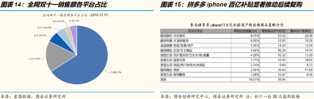 其并不特别注重双十一期间的促销氛围渲染,但通过差异化竞争策略在存量和增量用户市场均有所斩获,根据我们的数据口径,拼多多依托爆款iphone11百亿补贴的打法,获取了一批新用户逐渐理解和种草拼多多平台,开始在其它品类上做尝鲜。