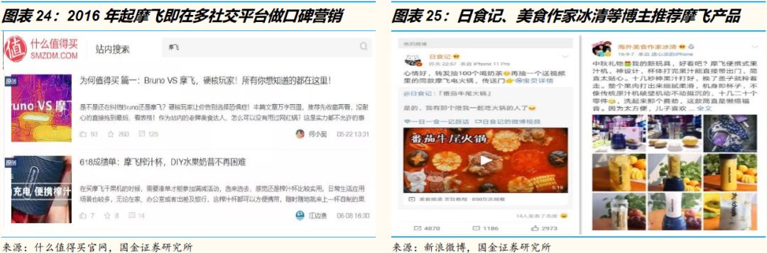 在微博上,许多美食博主在高频推广摩飞的产品,例如拥有1817万微博粉丝的日食记在双十二的抽奖中,送出了视频里同款摩飞电火锅。海外美食作家冰清在2016年开始推荐摩飞便携式榨汁机。同时,新宝也在穿搭博主、手账博主等生活类博主间投放软文物料。