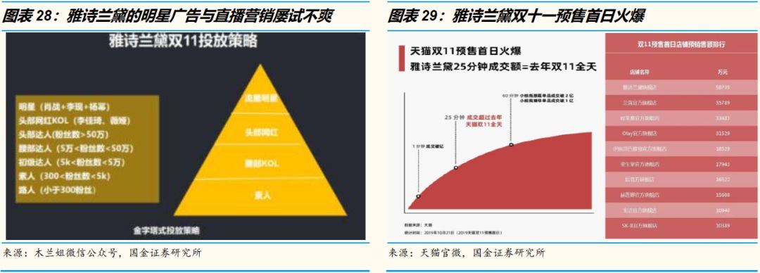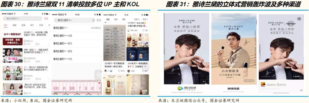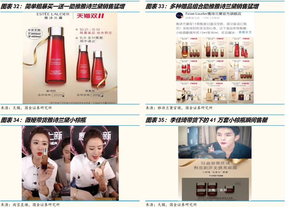 综上所述,雅诗兰黛通过充分多样化的营销玩法、简单粗暴的买一送一和单品直降的促销力度、以及双十一重磅新品首发的多重策略组合,引爆了品牌在双十一盆满钵满的赚钱逻辑。我们认为,全渠道运营玩法的门槛较高,拥有强大品牌资产和时间积淀的品牌,随着对各类渠道的接触与玩法的碰撞,能够逐步通过全渠道玩法获取竞争壁垒。