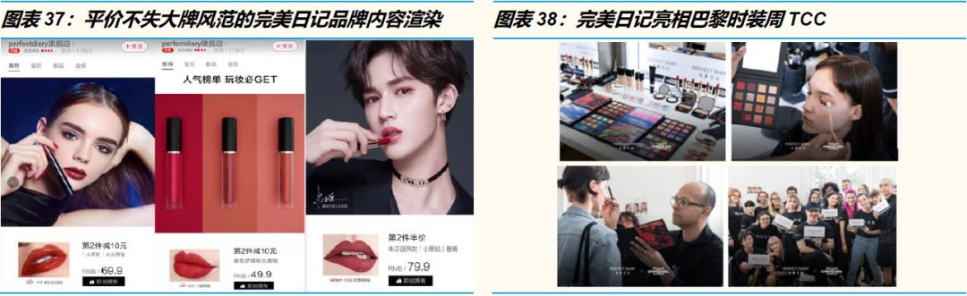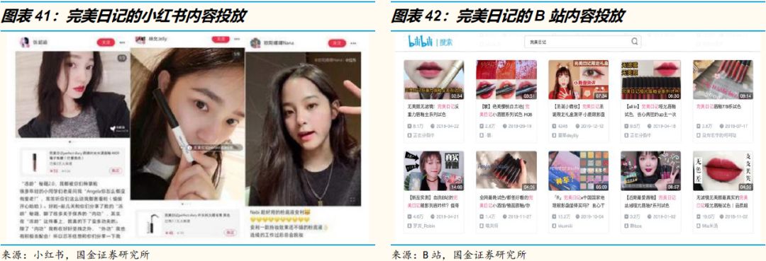 完美日记也在2019年起逐步设立线下门店,采用混合业态型门店,分别设置了产品展览区、体验区、会员区,部分城市的体验店具备咖啡休闲馆及各类打卡点,店内爆款产品可免费体验。完美日记线下概念店加强了互动性、社交性与沉浸感,升级用户体验,增强用户内心的品牌认知,以期不断扩大品牌影响力,并摸索线上线下销售导流的模式。