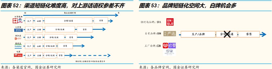 同时,白牌也在进军线下寻求新突破,但我们认为白牌将更多通过集合店的形式进驻实体门店。白牌因供应链能力两级分化明显,品牌价值内涵尚未成熟,自身发展本身受一定限制。在布局下沉市场的同时,部分白牌开始进军线下寻求新的突破。但由于白牌普遍缺失线下渠道资源,通过体量较大、资源较多、具备相关经验的公司以及平台进驻集合店,以提升线下竞争力,抵御开店风险。