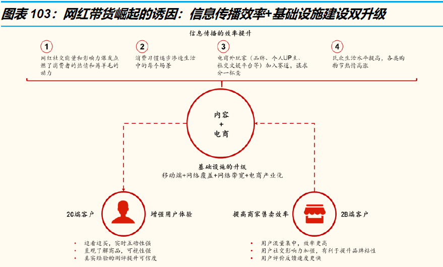 直播带货的政策风险与商业模式同质化隐患:《广告法》与《电子商务法》都对带货主播以及电商平台提出了监管要求。为了充分保障消费者权益,未来的监管态势趋严。同时,随着各直播平台目的趋同(吸引用户转化),带货直播同质化的形势可能难以获得流量关注,用户兴趣点可能随时发生转移导致直播渠道流量下滑。