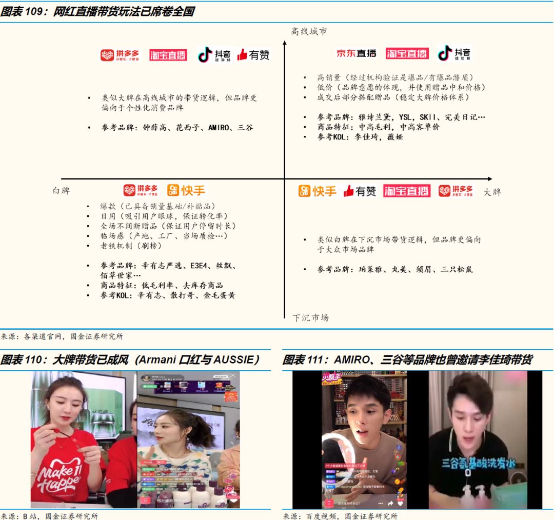 因此,我们认为白牌在下沉市场采用直播的形式进行渗透的效果会远好于其它渠道营销手段。同时,网红直播带货跟随着社交媒体上传播范围的外拓,头部网红流行度不断攀升,目前一二线城市的大牌和腰部品牌的直播带货已然成风。