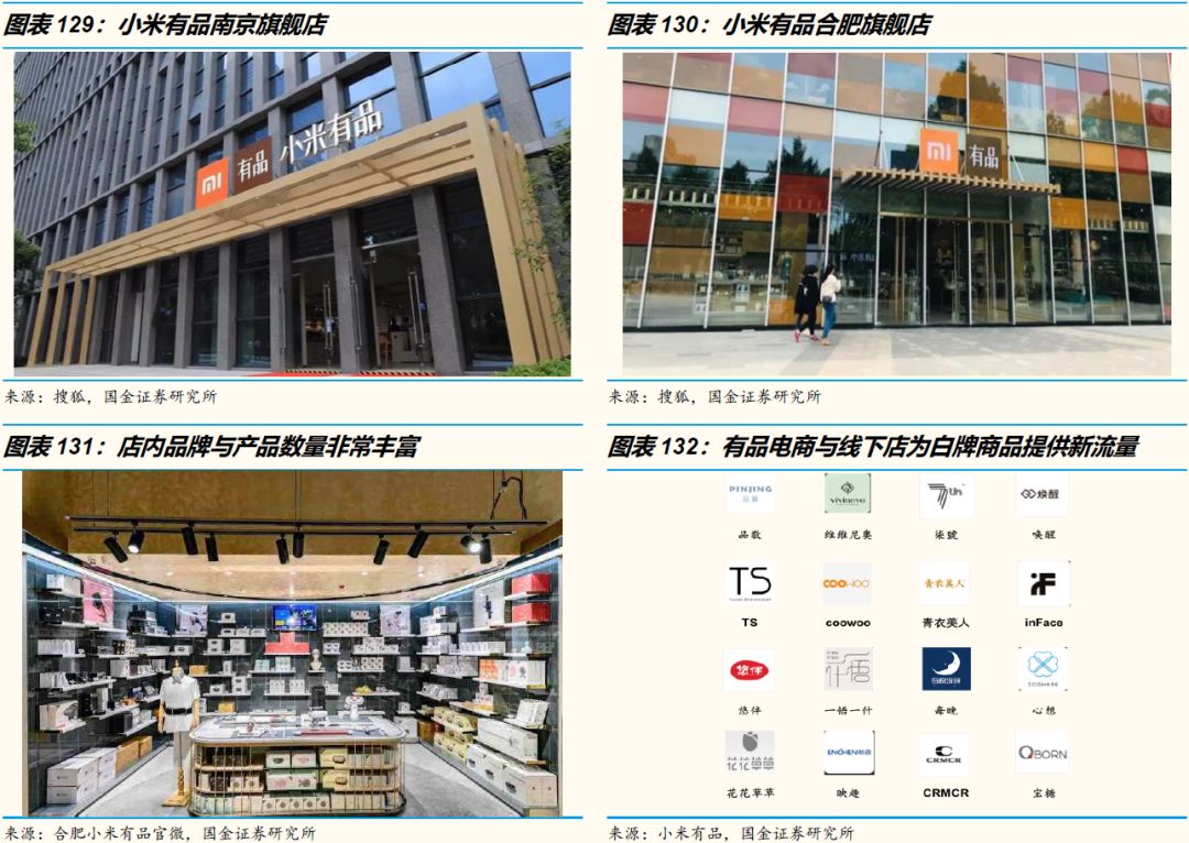 我们以小米有品为例,小米有品除线上主力电商业态外,引入了大批拥有设计、制造、销售、物流、售后等部分乃至完整链条能力的白牌产品。小米有品合肥旗舰店店内500多平米面积展示近2000种商品供体验选购,涉及手机、智能、居家、服饰、鞋包、餐厨等各个生活消费品品类,有品线上售卖的17大品类在店内均有展示,品牌来源除生态链企业自有品牌外,另含100多家非生态链企业的品牌产品。