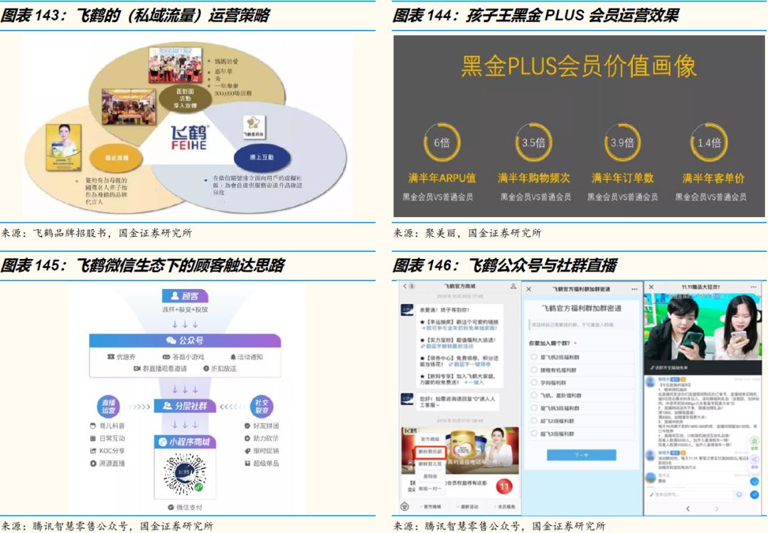 此外,飞鹤、孩子王等各母婴领域头部品牌也通过私域流量玩法获取了可观的持续性流量获取与业绩提升。飞鹤通过线上线下联动拉新,线下地推(线下妈妈培训班)、优质内容输出(飞鹤星妈会公众号+鹤粉聚乐部)、会员社区运营(社群直播)等私域玩法,品牌溢价能力显著提升,几年时间里从年销售额30亿做到100亿规模,2019年上市的估值接近800亿;孩子王在一般社群运营的基础上,将员工升级为育儿顾问,用户可以购买某一员工的专属服务,即黑金PLUS会员。育儿顾问会为顾客定制专属育儿方案,并且长期追踪客户动态,不断调整方案。孩子王黑金会员目前已突破50万人,与普通会员相比,满半年的黑金会员ARPU值是其6倍、购物频次是其3.5倍、订单数是其3.9倍,满半年的客单价是其1.4倍。