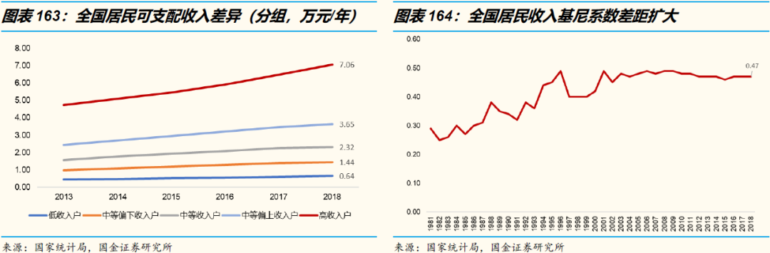 绝对数额方面,前20%的高收入户人均可支配收入远高于其他80%居民。即使是中等偏上收入户2018年的人均可支配收入也刚达到高收入户的一半;后20%的低收入人群人均可支配收入不及高收入人群的1/10。基尼系数也直观反映出全国居民收入差距不断扩大:过去十年间,国内居民收入基尼系数已从90年代的0.35左右涨至0.47左右,高于国际警戒线0.4,接近红线0.5。