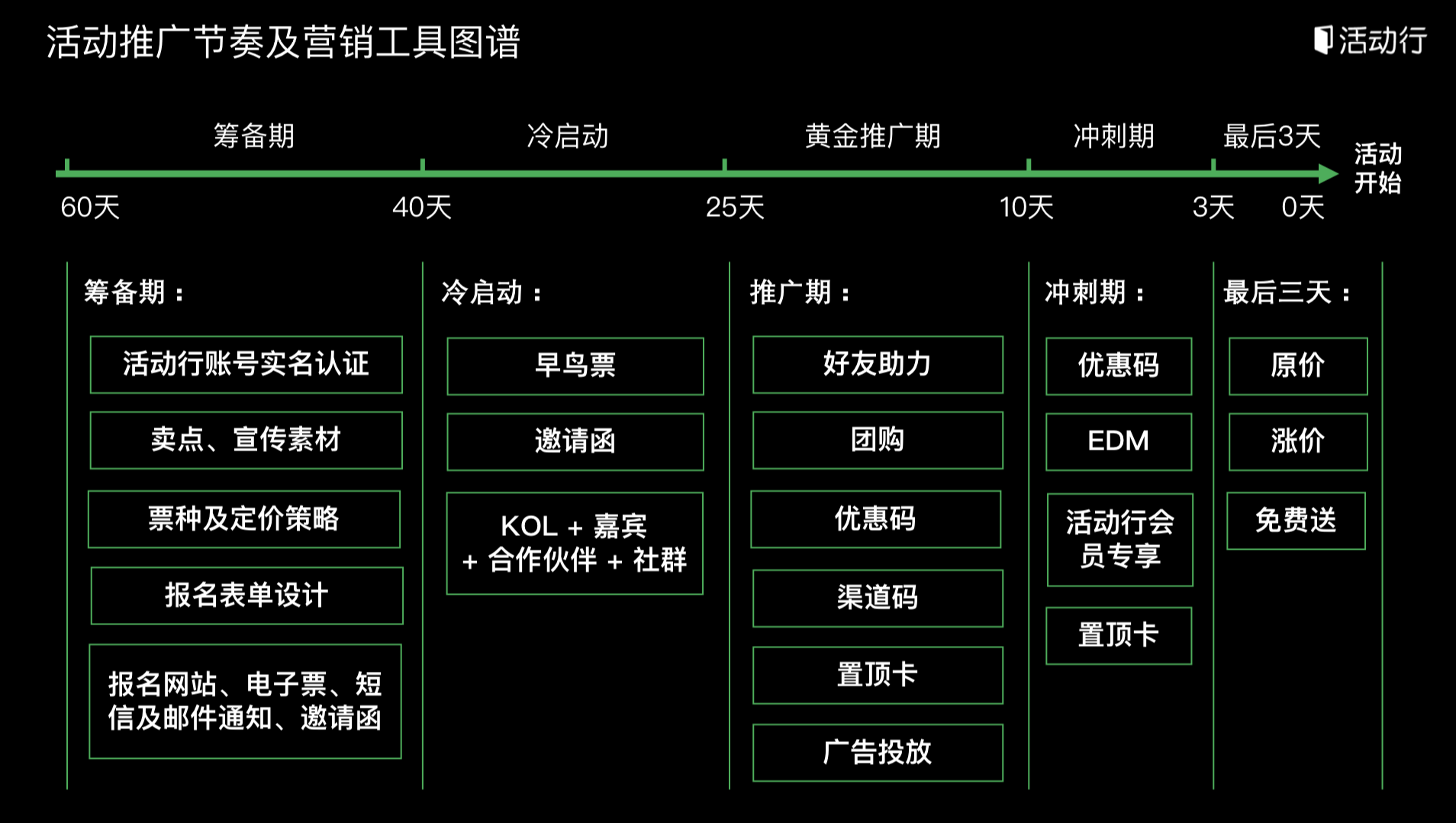 下图是我们根据活动周期总结出的推广手段,在活动的各个阶段活动行都有相对应的功能助力推广。